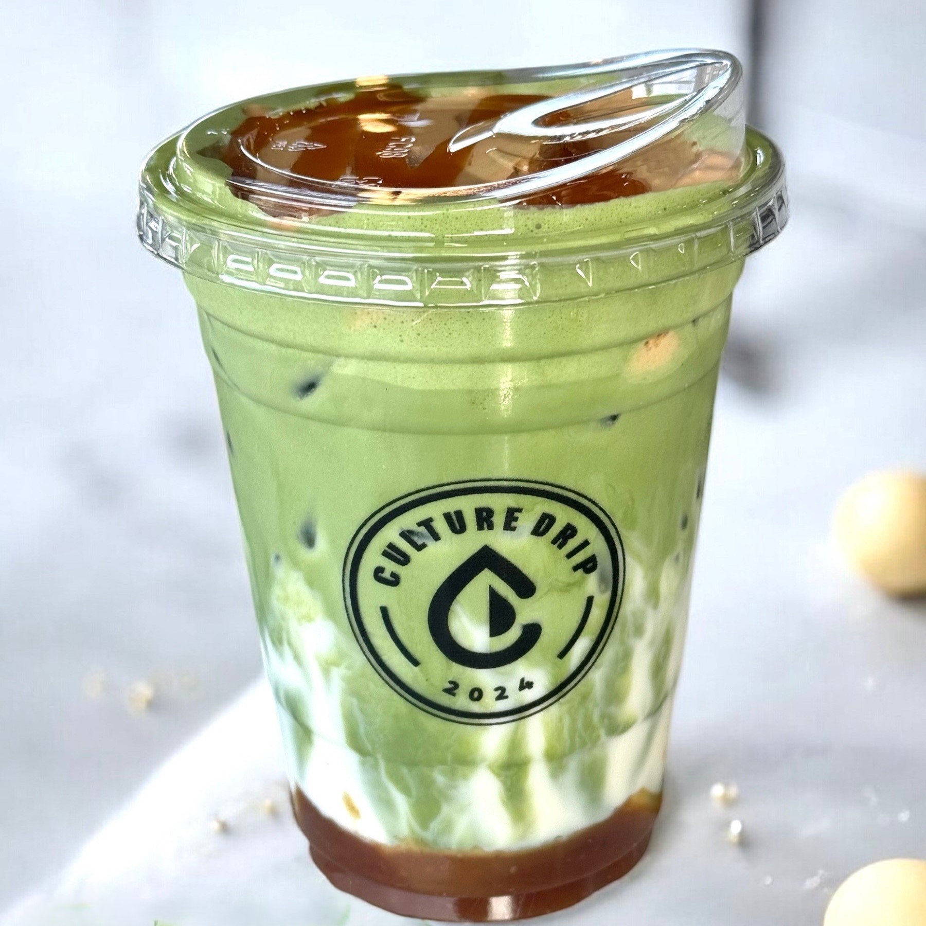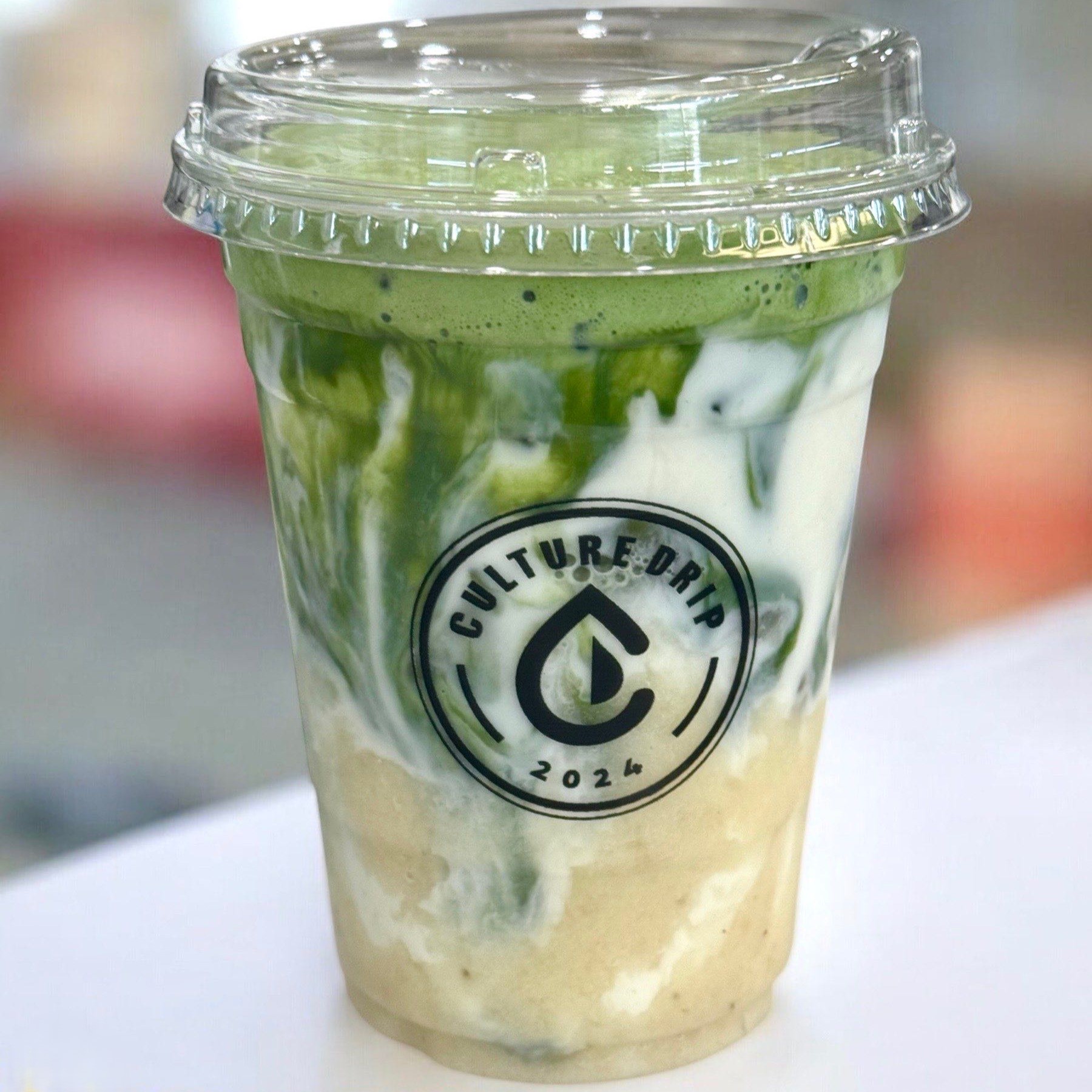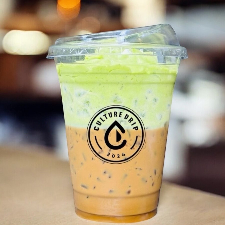 Bold Vietnamese coffee and creamy oat milk are layered beneath a smooth, slightly bitter matcha top.