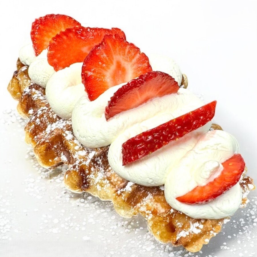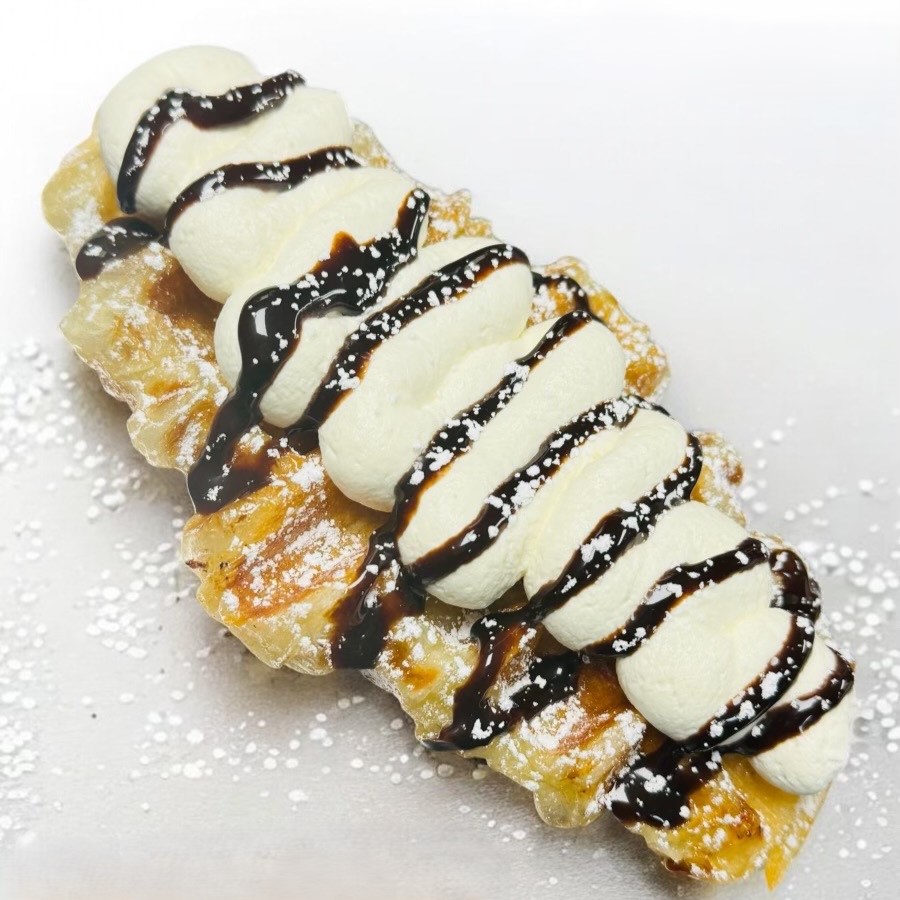 Made to order buttery crossiant waffles dusted with powdered sugar and topped with cream