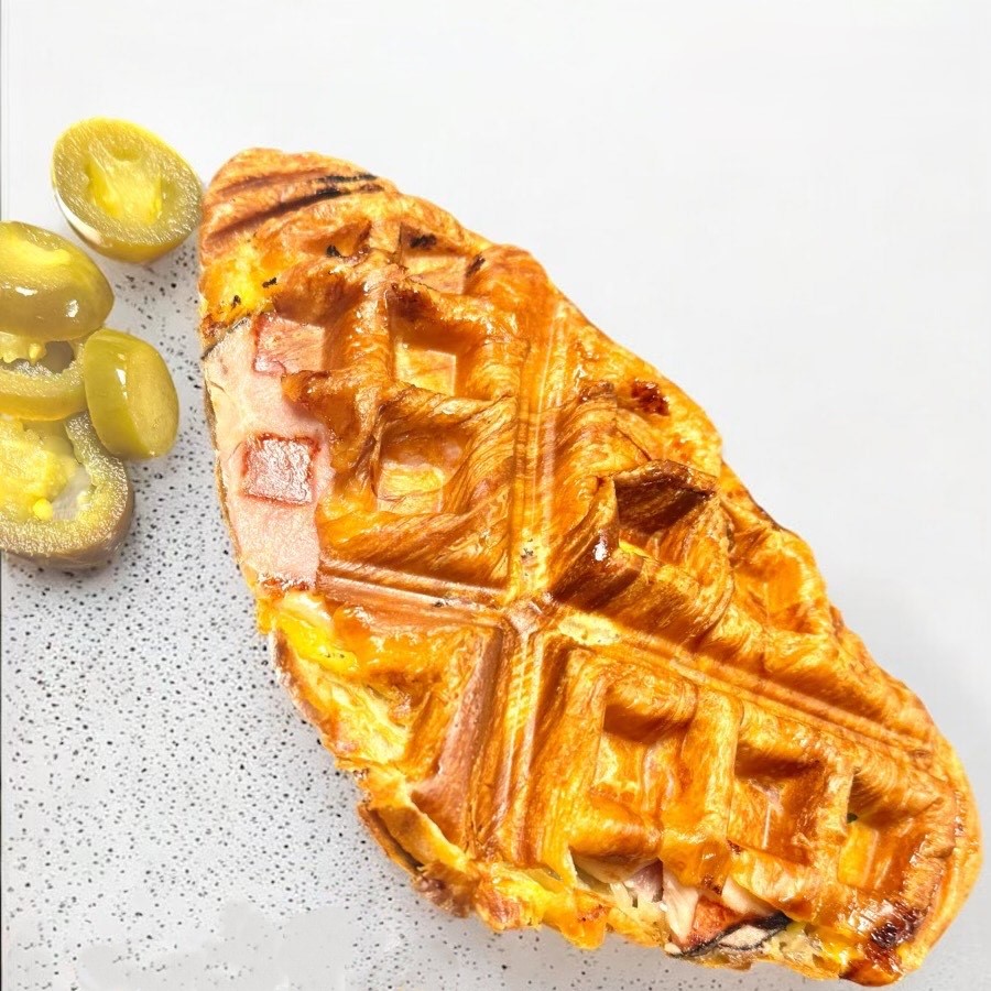 A warm, flaky croffle sandwiched with savory ham, melted cheese, and a kick of fresh jalapeño.