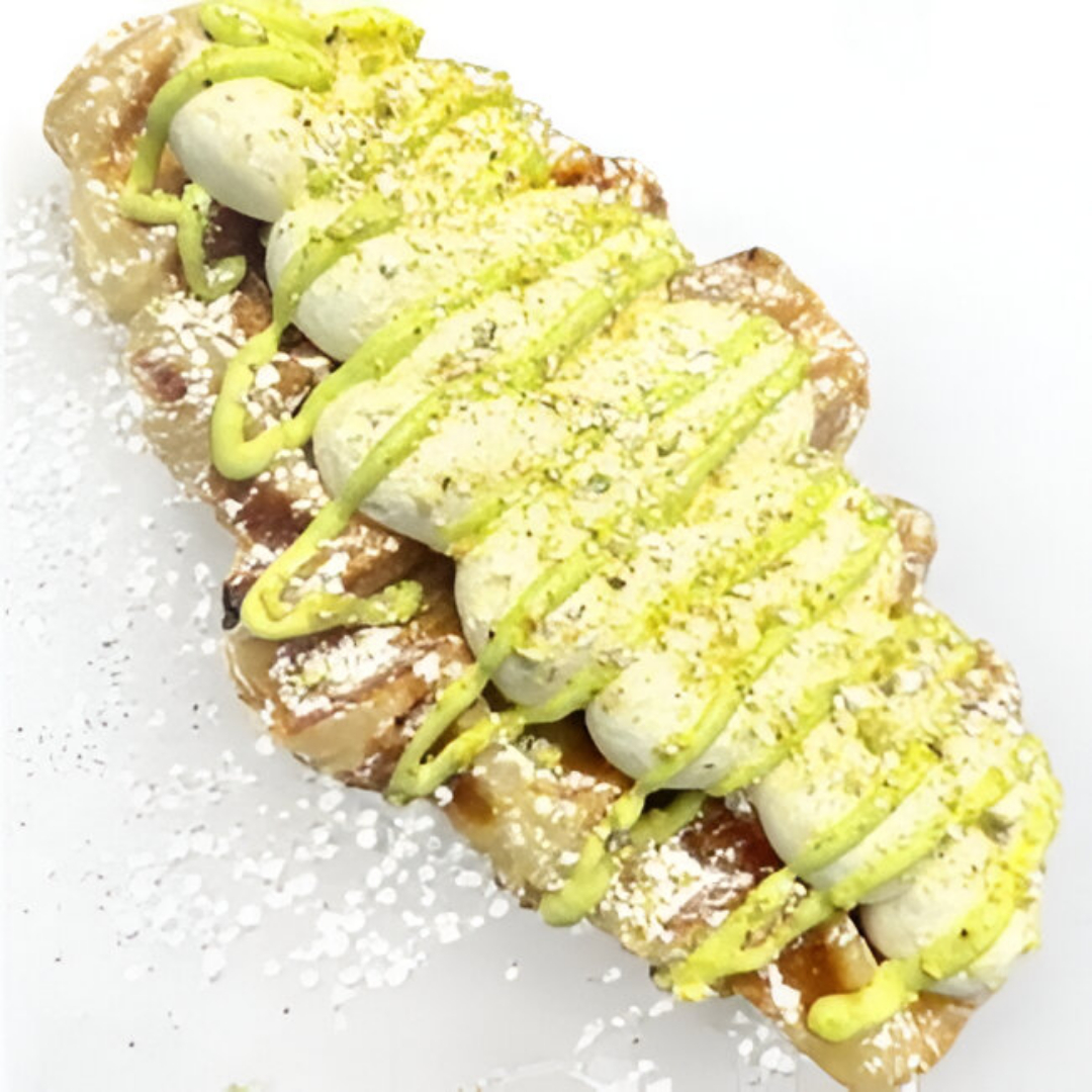 A warm croffle topped with a rich, creamy, and nutty pistachio sauce and crushed pistachios.