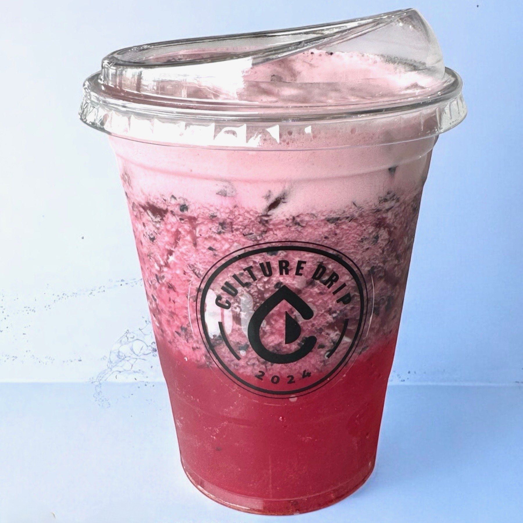 Premium matcha poured over a subtly tart and sweet pureed blueberry base.