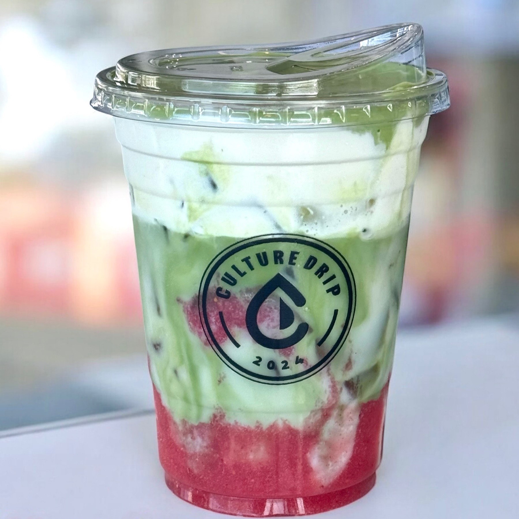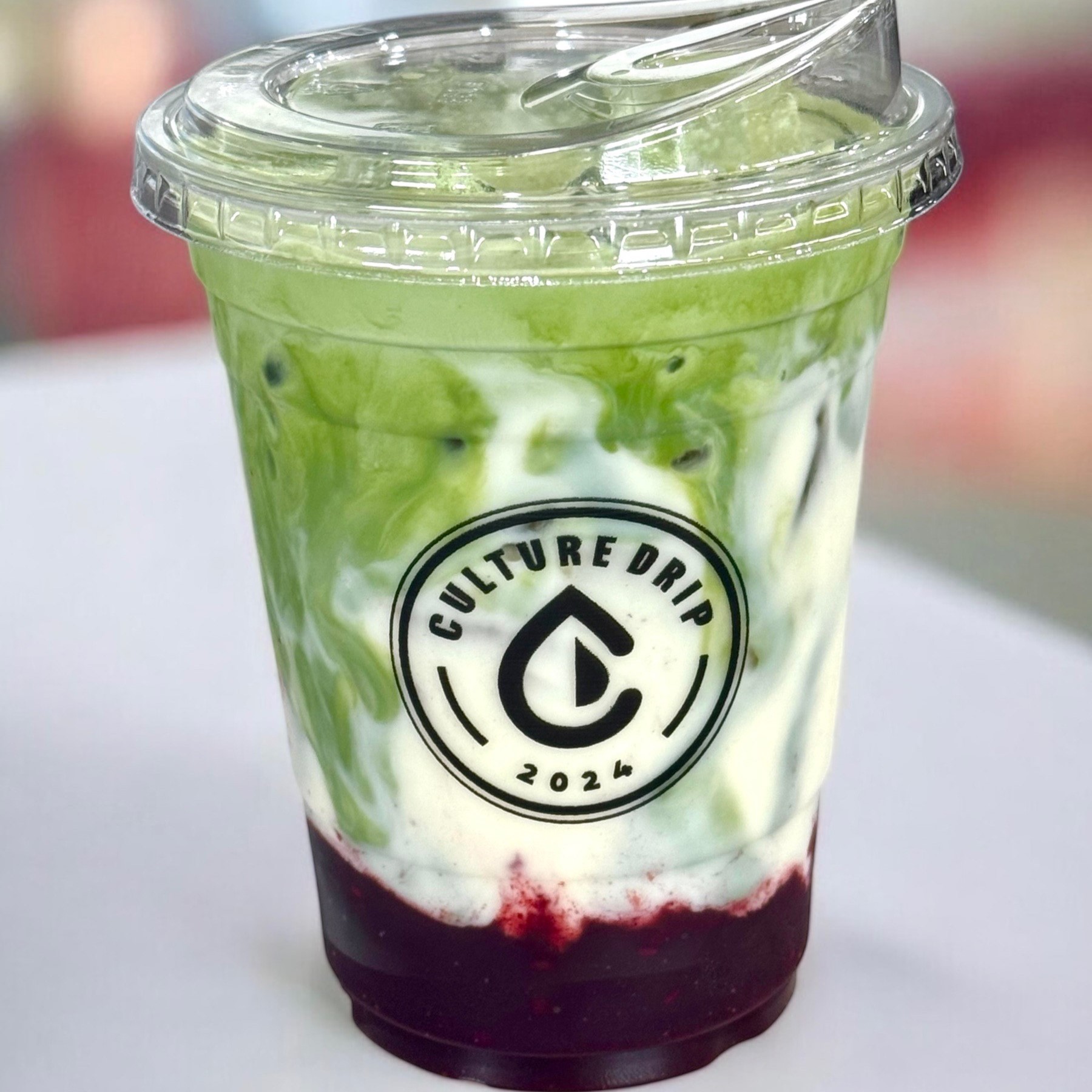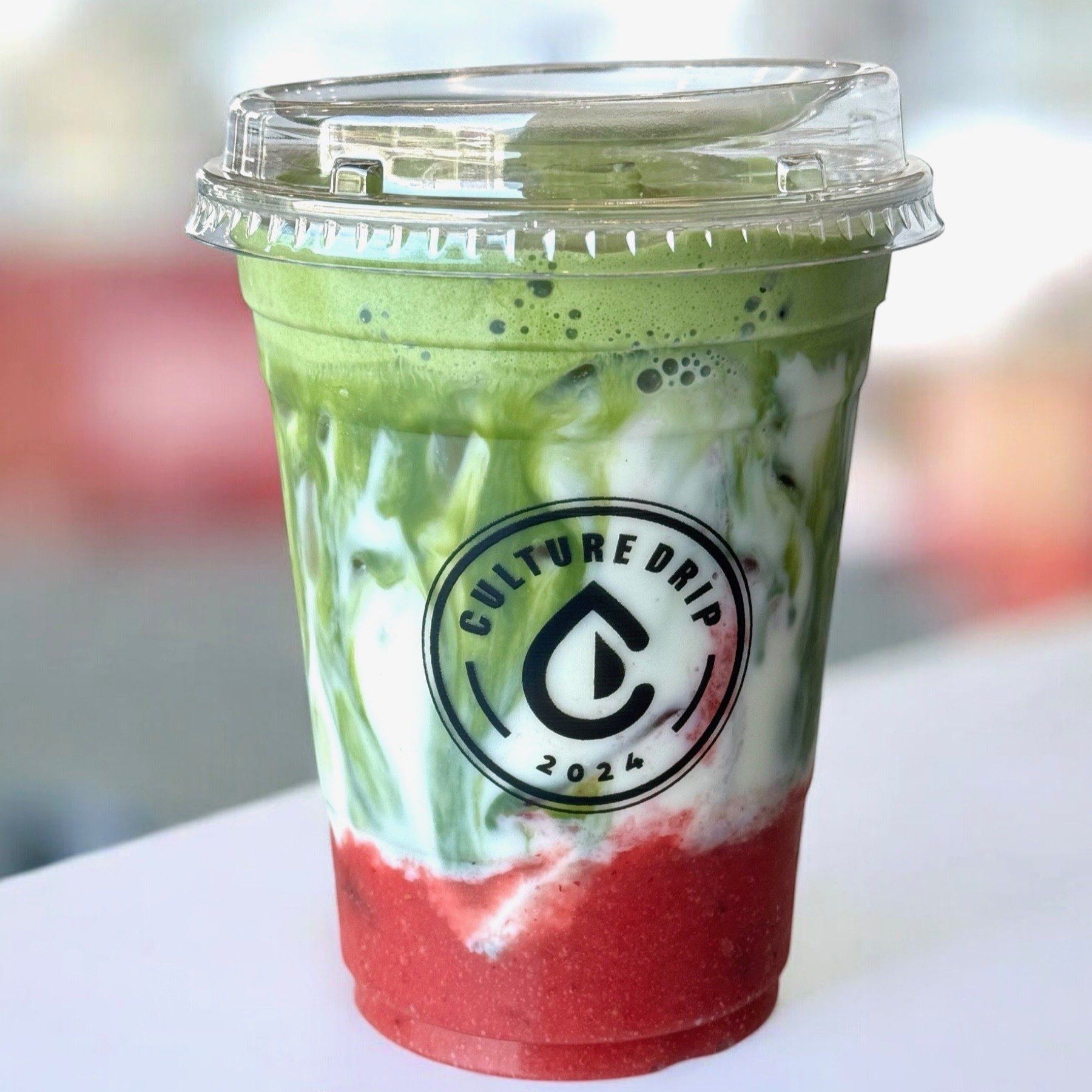 Matcha poured over a sweet strawberry purée base and finished with a rich, tangy cream cheese foam.