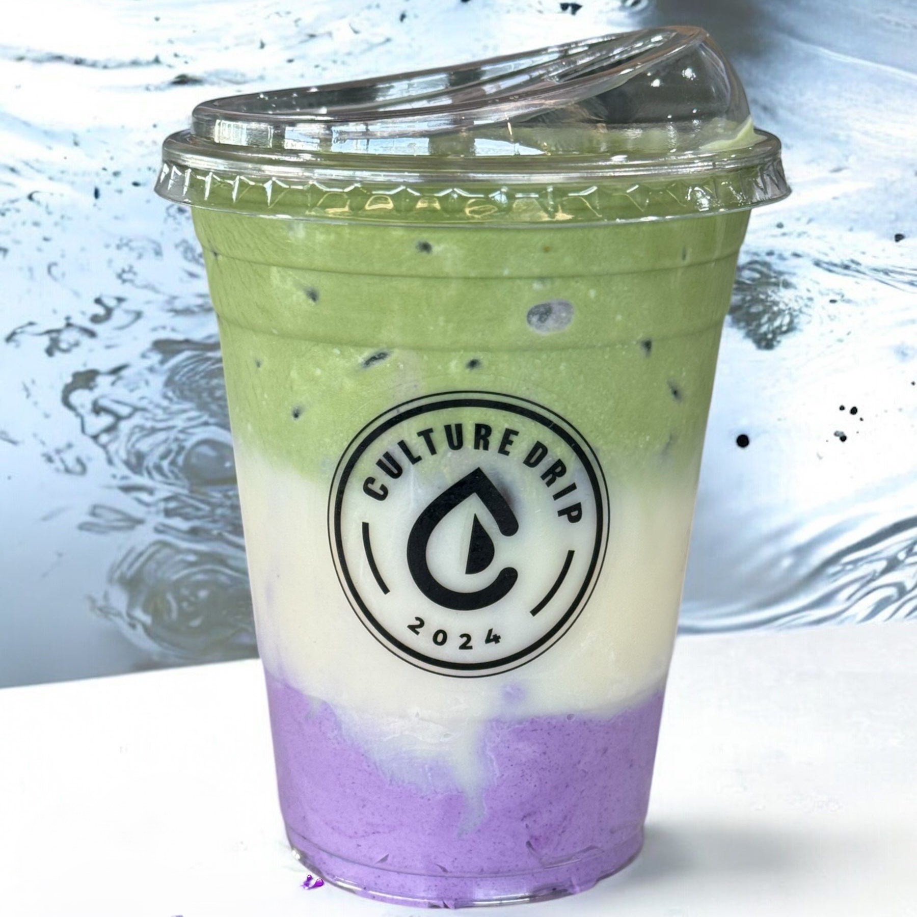 A vibrant Ube (Purple Yam) foam is mixed into creamy oat milk and then topped with a layer of premium, earthy matcha.